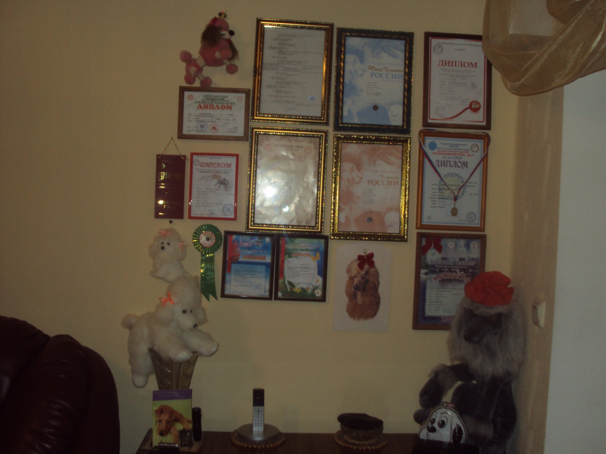 Стена почета очень классно! Я все собиралась Дашины чемпионские сертификаты в рамочке повесить на стену, так и не повесила, а теперь и места нет, повесила подаренные вышивки, портрет Дашин и свою картину из страз :) _______________________________________