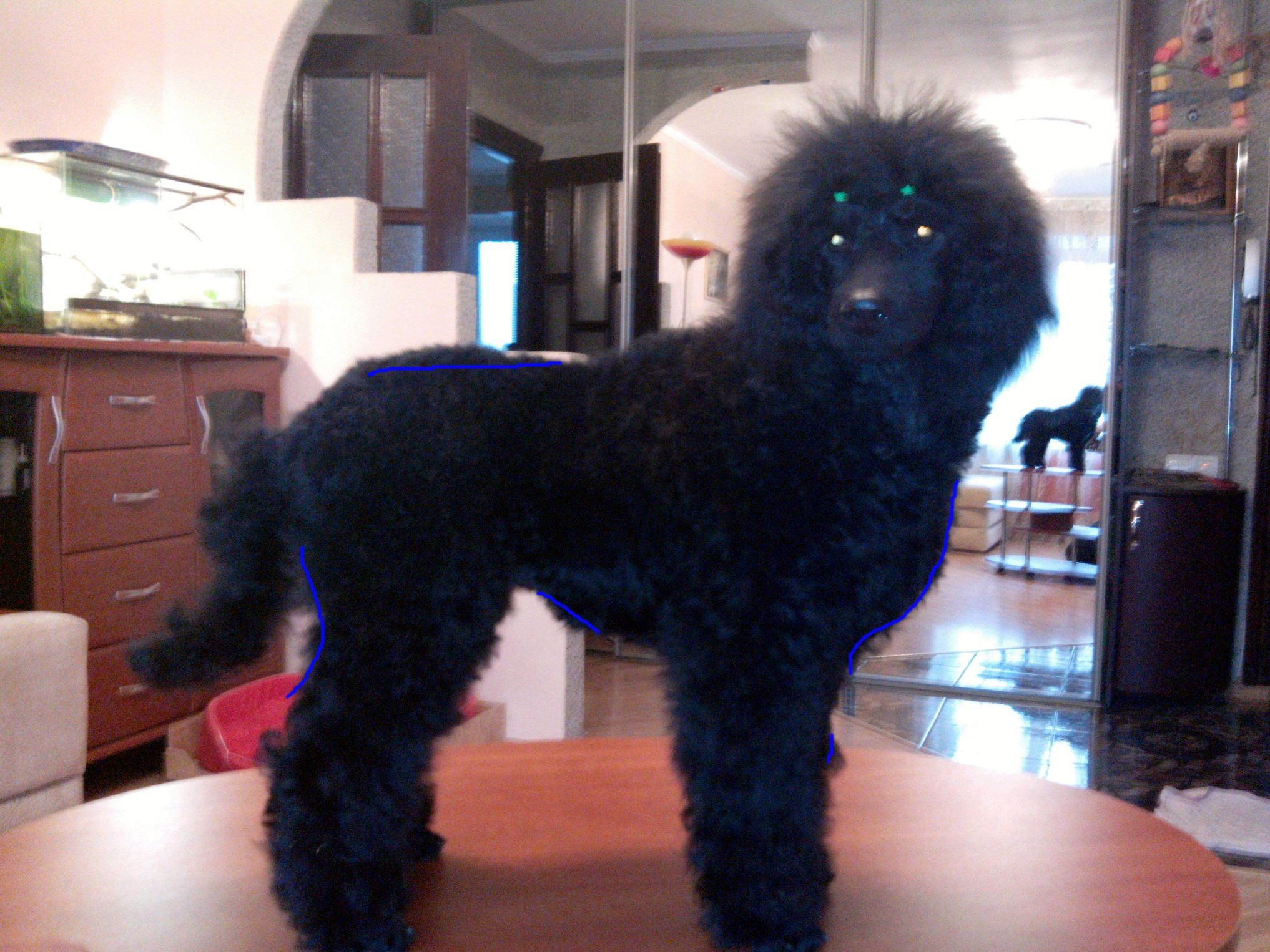 Даша, на мой взгляд стричь пока особо нечего сейчас. Я бы постригла немного на крупе, чтоб не было этого горбика и была ровная линия верха и прошлась бы везде финишными ножницами, подравнивая торчащие шерстинки. Пока все.