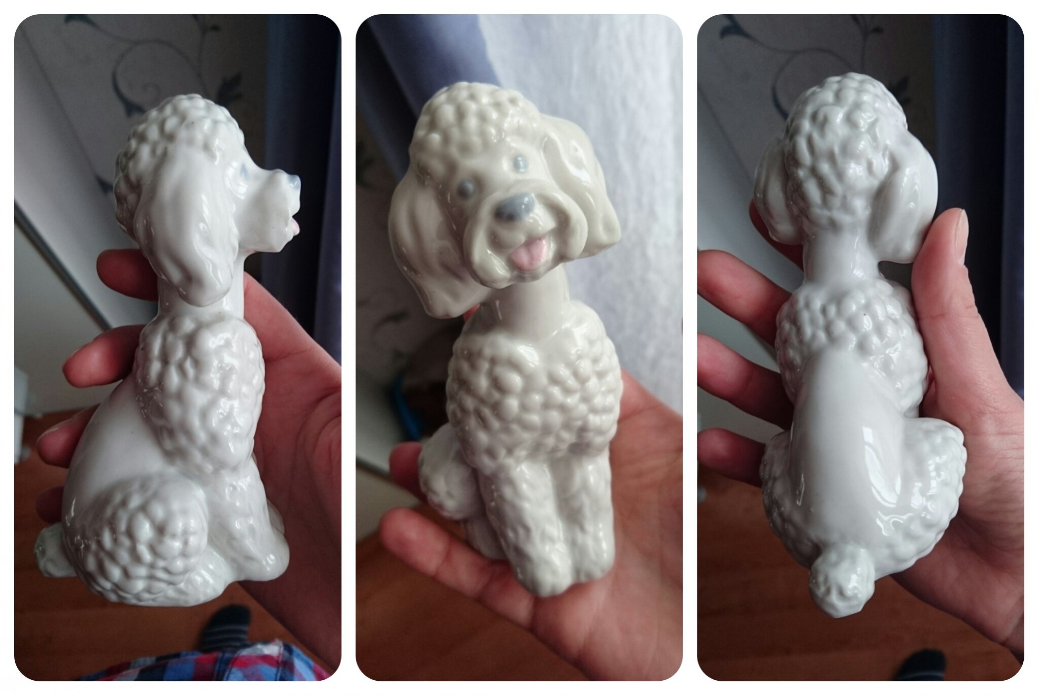 Очень давно хотела и искала предложение, которое меня бы устроило по цене и виду самой статуэтки, без зеленого оттенка и пятен. 1. Статуэтка "Пудель". Фарфор, роспись. УССР, Киевский экспериментальный керамико-художественный завод: 2. Металлический тяжелый пудель и Фарфоровый который занял свое место на полке) _______________________________________