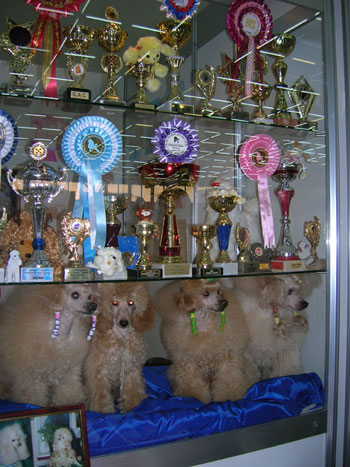 А я расскажу немного о нашей выставке. Сама она была не очень интересная, просто городская, а вот организована была очень необычно. Проходило все в рамках выставки "Мир животных" для широкой общественности. Выставлялись собаки, кошки, лошади и т.п. А у нас был свой стенд, предоставленный клубом и украшенный нами! Основной задачей было показать народу красивого пуделя. И мы показывали целых два дня. Вот так это выглядело _______________________________________