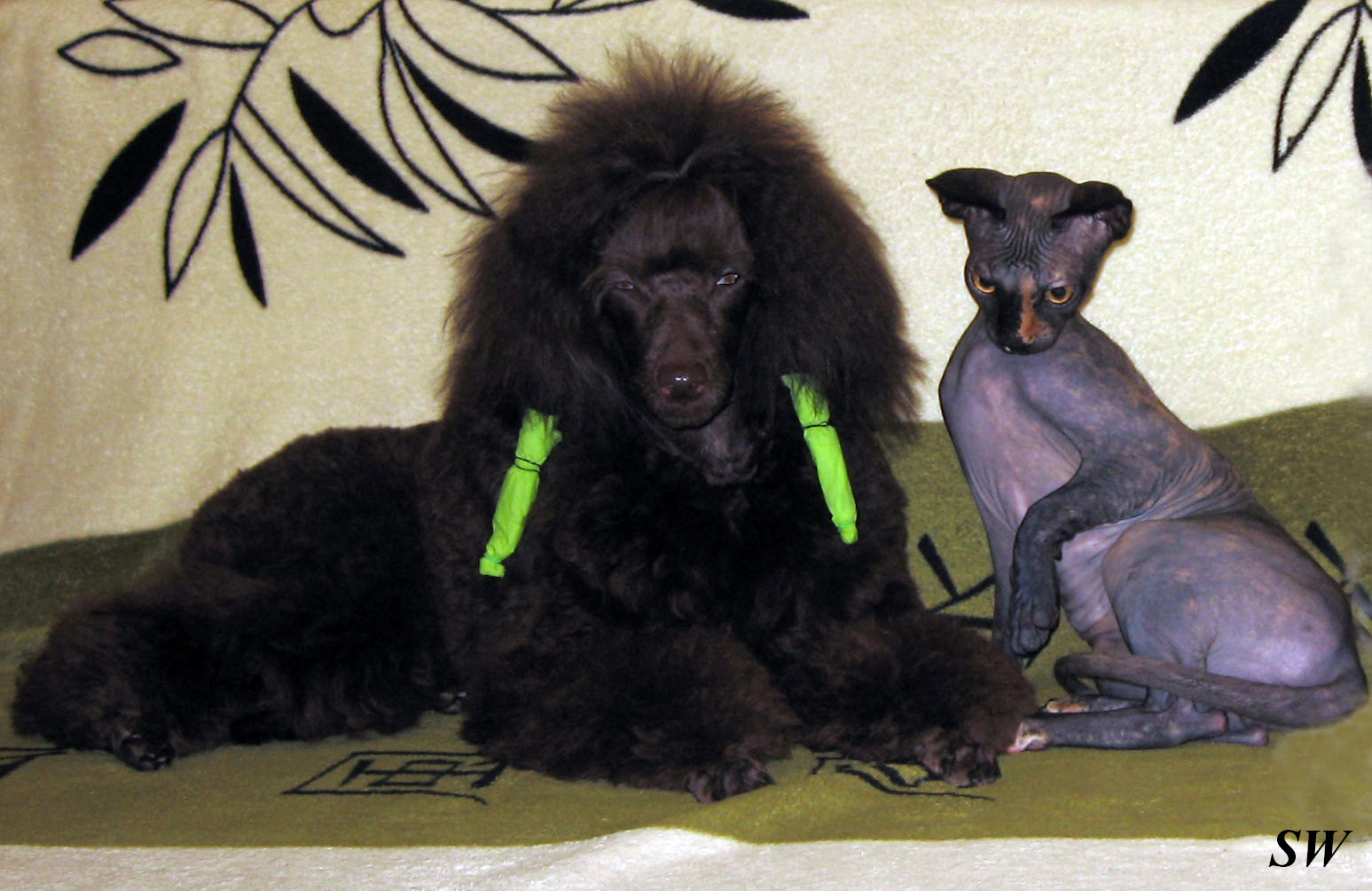 Это мы были в гостях, где кошечка выросла с собаками, с пуделями, мои были в шоке))) кошка которая не убегает и не фырчит и не кидается, за которой даже гоняться не интересно)))