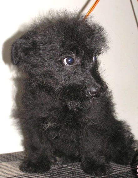 Папаша мелкий терьерчик. Окрас черный. Шерсть жесткая. Я предполагаю ( по костяку и кое-каким еще приметам), что песонька будет крупнее своих родителей - примерно 38-40см. Так сказать, эффект гетерозиса... А экстерьером будет сильно смахивать на керн-терьера. Сейчас шерсть двойная. Такой и останется, только наверняка излом появится. Линять вряд-ли будет. Окрас чисто черный с небольшой белой прядочкой на грудке (как у мамы). Маму подстригу дня через два. Пусть немного обживется. Тогда повешу здесь и маму красивую. _______________________________________