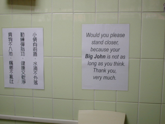 Перевод для не читающих по-английски: "Не могли бы встать поближе потому что ваш БОЛШОЙ ДРУГ не такой длинный как вы думаете. Большое спасибо". Реальная надпись в малазийском туалете. _______________________________________