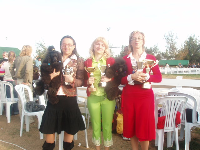 В шестерку лучших щенков выставки из огромного количества щенков попала щеночек черного пуделя тоя клички не могу написать нет каталога, но это щенок форумчанке Фенечка- она , я думаю, кличку допишит. А в юниорском бесте в 6 также из очень большого количества юниоров попала карликовая коричневая сука Золотой Пояс Роксана. _______________________________________