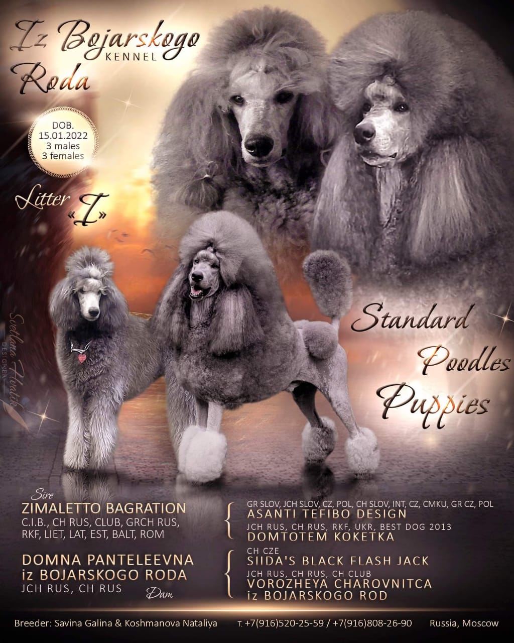 Питомник "Из Боярского Рода" предлагает щенков большого пуделя серебро, рожденных 15.01.22г. Отличная родословная, родители тестированы. Метрика щенка РКФ, клеймо, прививки по возрасту. Щенки с великолепной психикой и характером, для шоу и для души. 2 кобеля и 2 суки.