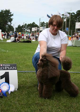 Моя Рада стала ЛЮ и ЛПП, хоть и попыталась мне "объяснить" что трава то мооокраяяяя и противнаяяя, зато Пружинка смотрела на меня с таааким видоммм!! "мать, ты в своем уме! Я же ПУДЕЛЬ! Я же прическу испорчу! Уберите эту гадость!" И очень брезгливо поднимала при беге лапы, а потом вообще скакать начала... и в результате наскакали мы 2место на сравнении сук, уступив рыжей красавице из нашего же питомника - Рыжей Осени из Р.С. кторая и стала ЛПП!