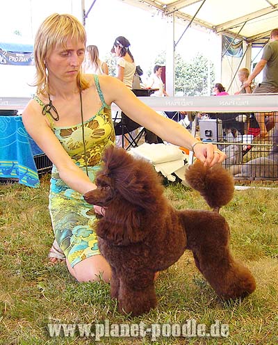 Естонцы, что у вас там было, расскажите... FCI accepted a new standard for poodles in March 2007. In the standard there is some mentions about clipping - but ever since March poodles all over Europe in so called "second puppy clip" have got cc and CACIB but..... in Estonia 22.7.2007 Fernando Rodrigues, Portugal, proclaimed, that second puppy clip is not correct according to the standard and he gave zero to 14 poodles out of 15 entered because of the clipping - including many international and multi ch. most of them outside Estonia So what to think about this? Is it the Wild West or..... regards Maylis Spiik, Finland Natascha PP добавил(а) [date]1185197809[/date]: SZOMBATHELY (Hungary), 2007-07-21, CACIB, FCI Judge: ARADI CSILA (H) Standard Poodles (white, black, brown) BOB: HECTOR MARCO BOHEMICA, WHITE-MALE, Owner: Z. AZZOLLINIOVA BOS: TOY MAX FULL HEARTED LASS, WHITE-FEMALE, Owner: G. HECKMANN Standard Poodles (apricot, silver) BOB: TOY-MAX FINE FUTURE, SILVER-FEMALE, Owner: M. FINE Miniature Poodles (white, black, brown) BOB: DOMINIQUE CHOCO ANDREA`S FLOWER, BROWN-FEMALE, Owner: A. GROSSMANOVA BOS: ILOS ARCANUS ILIRIA, WHITE-MALE, Owner: N. KLIROVA Miniature Poodles (apricot, silver) BOB: AGNUS DEL BANZETTE, SILVER-MALE, Owner: N. CZURDOVA Dwarf Poodles (white, black, brown) BOB: SKETCH`S WHY NOT, BROWN-FEMALE, Owner: R. SMEKALOVA BOS: CASPIAN LINE`S CURLY MIRACLE, BLACK-MALE, Owner: N. KOLBE Dwarf Poodles (apricot, silver) BOB: FRODO VOM ORECHERS HOF, SILVER-MALE, Owner: K.+ R. LINK Toy Poodles BOB: SOLNES DUBBEL RAIN, BLACK-MALE, Owner: J. SVOBODOVA BOS: COCO SHANEL, BLACK-FEMALE, _______________________________________
