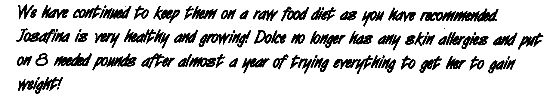 У них есть еще 11,5 летняя абрикосовая дама, у которой были постоянные проблемы с кожей, аллергии и прочее... И как результат - собака была слишком худа, несмотря ни на какие ухищрения. Когда они забирали щенка, я им сказала, что дети жрут сырую еду и иногда сушняк, дабы знать, что это такое. Они решили продолжать кормить ребенка так же, а заодно попробовать перевести старшую собаку на такую же диету. Перевожу выдержку из письма. "Жозафина (это щенок) очень здорОва и растет. У Дольче (старшая собака) больше нет кожных аллергий и она набрала нехватавшие ей 8 фунтов (около 4-х кг) после почти года попыток заставить ее набрать вес" Добавлю только, что старшую собаку они перевели на сырую еду в момент, без всякого постепенного перевода. |