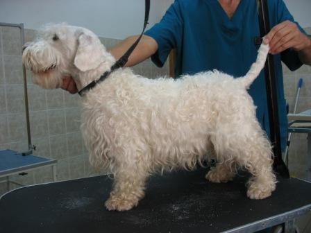 Привели его с уже стриженной головой и задом - на мой взгляд и там и там состригли лишнего - я бы сделала по другому. Щипать пришлось пальцами и с мелом, так как от тримминговочного ножа шерсть просто рвалась (это при том, что я работаю очень тупыми ножами).