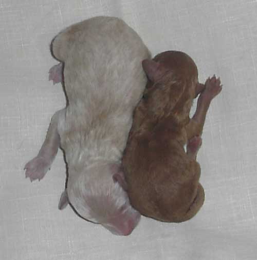 в субботу она родила щенков от Варкрафта. он яркого и насыщенного красного окраса (однако, также чуть потемневшего, по сравнению с тем что было при рождении). и что интересно тожес очень тёмным то рождения пигментом. щенко пятеро. два сразу просто красных и три пока светлые (один так прямо совсем), но набирают с каждым днём. Все светлые щенки и один красный родились с тёмными носами и чёрными пятками. У второго красного щена пигмент проявился в течении первых суток. Вот фото самого светлого щена с нечерноносым красным |