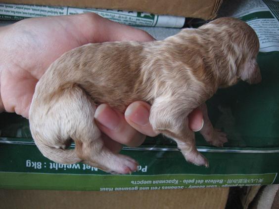 в субботу она родила щенков от Варкрафта. он яркого и насыщенного красного окраса (однако, также чуть потемневшего, по сравнению с тем что было при рождении). и что интересно тожес очень тёмным то рождения пигментом. щенко пятеро. два сразу просто красных и три пока светлые (один так прямо совсем), но набирают с каждым днём. Все светлые щенки и один красный родились с тёмными носами и чёрными пятками. У второго красного щена пигмент проявился в течении первых суток. Вот фото самого светлого щена с нечерноносым красным |