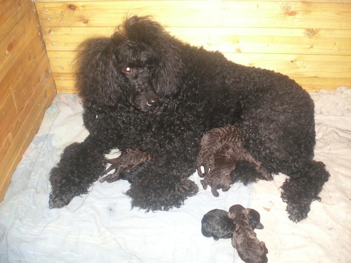 Все собаки здесь такие красивые. А у меня народились тикие чудики,что в первые 3 часа я была просто обалдевшая и не могла понять что это такое. только к утру разобралась,что моя черная пуделиха от черного кобеля родила из 11 штук 9 коричневых. К счастью не все живые.Мня убили розовые носы,непонятный окрас новорожденных. они все такие бывают пока не обсохли - не черные и не коричневые?Показываю детей в 5 дней. Позже покажу что вырасло.