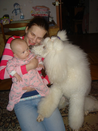 У меня ситуация така... Тойка и купила еще щенка королевского пуделя... как я потом сама и забеременела... и родила ребенка при пуделях... Тойка вредничает как маленькие собачки, иногда норовит прикусить :) но для вида... А королевский кобель отлично ладит с ребенком... даже не рыкает....все ей позволяет... Вот фотка там сразу видно трое собак... Третья собака была на передержке... она сука, я скажу что мой кобель лучше относится к ребенку чем сука... а вот сука могла боком пихнуть ребенка и она падала.. от чего мой ребенок злился и плакал.... Но не кусалась и не рыкала и тоже позволяла ей то шерсть потрепать то уши подергать.... Моему ребенку 1 год и 4 месяца |