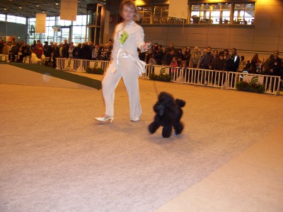 На эту же выставку, по-моему, ездила собака из Кирова , малая черная пуделица - Файма Сэм Айм от Сэма ф.Амадинехоф и Алисы Тил.