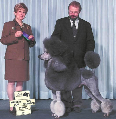 Обычный народ породу "пудель" воспринимает как что-то что можно на ручки взять:):):) Rococo, судья - мелкая, хендлер - тоже Они оба хорошо если 160 см роста... Собаку эту я видела на наших выставках - очень средняя для Америки/Канады собака - 25.5 инчей (64 см). Его дед - Del Zarzoso Fuego Fatuo ("Гордон") А как вам его цвет? Интересно, правда? _______________________________________