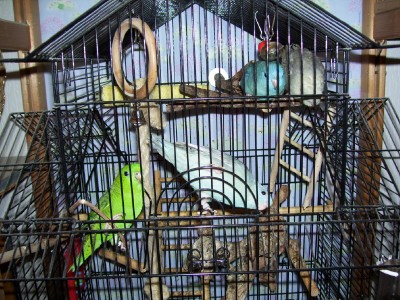 Outia, а клетка не маловата?...иль это только верхняя часть - т. н. "мансарда"? А попугайчики симпатишные - разноцветные.