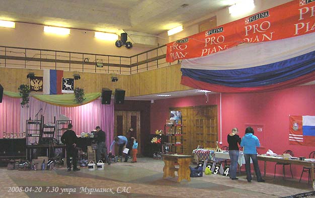 Отличный зал. По периметру ковровая дорожка (120см шириной). Положена и диагональ. Для зрителей несколько рядов стульев (вы не увидите потом на фотографиях собак привычного фона из пакетов, сумок и клеток - только зрители удобно расположившиеся на стульях). _______________________________________