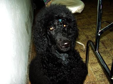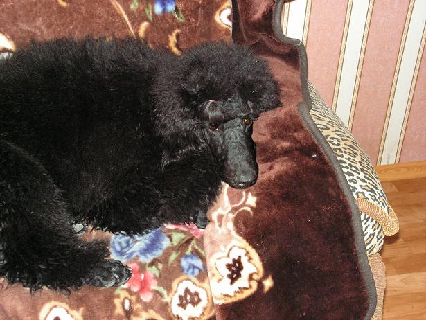 По случаю такого события небольшой рассказик За Роскошной Цыпочкой, которую дома мы незамедлительно переименовали в Киру, а потому для простоты я так и буду ее называть в дальнейшем, нам пришлось ехать в Тверь. О том, что такое щенки большого пуделя, я имела смутное представление. Так что знакомство с пятью двухмесячными детками, каждый из которых ростом, весом и общей комплекцией превышал взрослого карликового пуделя, было впечатляющим. Особенно, когда всей стаей они кинулись обнимать и целовать нежданных гостей. Впрочем, всей стаей - это не совсем точно. Кира знакомиться с нами не хотела категорически. Она выглядела такой скромницей, такой тихой и застенчивой девочкой, она так жалась к стеночке, что я, уже воспитавшая одного большого пуделя, была разочарована. Мне хотелось иметь боевую собаку. Хотелось столкнуться с трудностями, которые можно было бы успешно преодолевать. Хотелось драйва и адреналина. О, если бы я только знала, сколько адреналина ждет нас впереди… Оказывается, она была просто намыта и уставшая, все поспали, а она нет… В Москве нулевая температура. Но Кира никогда на улице не была, так что несем ее завернутую в покрывало, из которого торчит только голова. Ноша тянет, хотя и своя. Я то и дело подкидываю ее на руках, чтобы удобнее было держать. Уши взлетают и опадают - словно крылья черной бабочки. Чуткий нос, подобно флюгеру, поворачивается из стороны в сторону. Кире все интересно. Чувство страха ей пока неведомо, и потому она доверчиво тянется к людям, случайно оказавшимся рядом. Они смотрят на нее со светлыми, почти детскими улыбками. «Мама, это пудель?» - спрашивает малыш дошкольного возраста. А я несу свое сокровище, делая вид, что внимание окружающих мне не просто безразлично, - оно утомляет. Но чувство гордости переполняет меня. Вагон поезда переполнен. Нам достаются две боковые полки - верхняя и нижняя. На нижней устраиваюсь я, и Кире суждено провести рядом со мной первые полтора дня своей жизни вне родного дома. К нашему большому удивлению, экстремальная, с человеческой точки зрения, ситуация не вызывает у нашей собачки никакого дискомфорта. Она удобно устраивается на полке, отвоевывает у меня основательное пространство для своих длинных лап, голову кладет на подушку. На всякий случай вылизывает мое ухо, словно хочет сказать: извини, подруга, придется потесниться, но это не моя вина. Язык у нее большой и мокрый. Она шлепает им по моей шее, по щеке и хлюпает при этом так, словно втягивает в себя горячий чай. Я сначала терплю, потом не выдерживаю, спихиваю ее с подушки. Кира не обижается. Встает и уходит мне в ноги. Со вздохом ложится там, и я понимаю, что легче от этой ротации мне не станет - теперь она занимает половину полки, и мне приходится складываться вдвое, чтобы мы смогли уместиться. Ночью задыхаемся от духоты. Не знаю, кому тяжелее - мне или Кире. Я просыпаюсь на каждой большой станции, одеваюсь, хватаю собаку и выскакиваю из вагона. Хорошо, что мы догадались взять с собой поводок. Чем дальше от Москвы, тем ниже и ниже температура. Конец ноября - и по всей России уже лежит снег. Кире он нравится. Она с удовольствием ловит носом свежий морозный запах. Вдыхает холодный воздух, губы шевелятся, хотя морда при этом остается неподвижной. Она еще не знает, что снег создан для того, чтобы на него писать, но природа все равно берет с