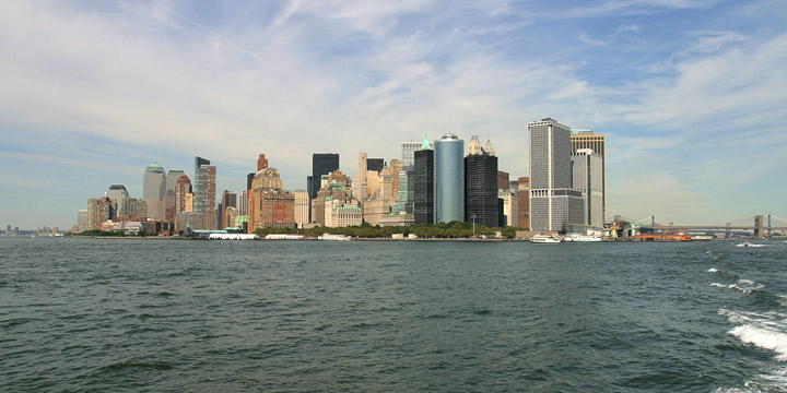 И еще один кадр. Здесь на переднем плане здания Генеральной Ассамблеи и Секретариата ООН. Голубое здание ровно посреди кадра - отделы и офисы ООН, ПРООН и других огранизаций системы Объединенных Наций. Здание со шпилем между двумя голубыми, Crysler Building, кажется выше другого шпиля, Empire State Building, но это оптический обман. Черная башня справа - Trump building, самый высокий в Америке жилой дом.