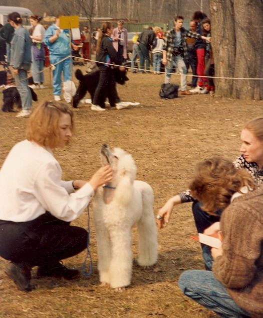 Суть в том, что я, посчитав себя уже достаточно опытной очень оригинально выставила собаку. Ринг задерживался. Все нафабренные экспоненты стояли в напряженном ожидании в руках своих владельцев. Садиться было противопоказано. Можно помяться. Какой кошмар, Кветочка устанет, подумала я и спокойно уложила собачку на подстилочку. Столов еще в помине не было. Меня пытались призвать к порядку. Тщетно. Собачке надоест стоять и она выйдет в ринг невеселая. Настал час идти в ринг. Я даю Кветочке команду "Гулять" а потом "Барьер". Квета сиганула через ринговое ограждение. "Побежали", задорно скомандовала ей я. Мы весело побежали. Потом, естественно, встали. Тоже весело. В настоящую свободную стойку. Как я писала, Квета делала ее сама, если я ей не мешала как на первой выставке. При этом я была сбоку. Я решила, что эксперт не понял, что Квета в свободной стойке. И бросила поводок. Эксперт был Вента, забыла сказать. В итоге я получаю описание в котором три раза было отмечено, что собака демонстрировала себя в свободной стойке! Описания раньше были длиннющие, было где три раза написать одно и то же! Вот это был ринг! Вот это был кайф! Как мы были с Кветой довольны друг другом!!! Ээээх! правильной дорогой я шла, товарищи! Только потом под влиянием авторитетов почему-то с нее свернула. _______________________________________