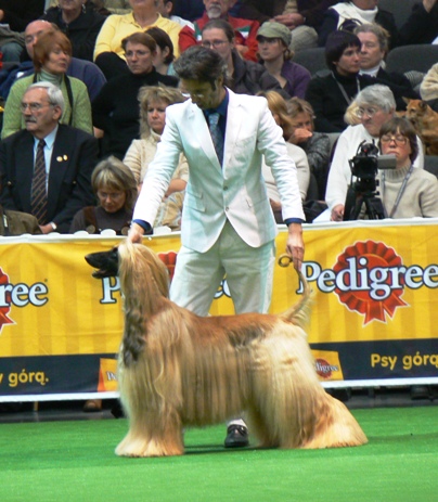 Мозайка я бы не сказала что эта афганка - классического типа, она действительно скорее "американка". С длиннющей шеей и короткая высокохольная. Нет замкнутого кольца на хвосте(у нас в свое время за это давали оч хор, типа как у пуделей сейчас тенденция), видно, что шерсть очень ухожена, но бывают и более "одетые" роскошные экземпляры. Ее конек, видимо, как раз движения. Очень женственная.