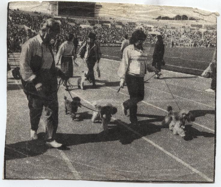 А я нашла вот такую вырезку из журнала "Огонек".Первая выставка клуба Элита .Парад собак на стадионе Динамо.это я,Чичева В. с Алиной Мик и ее сыном Атошка Айвар (умер в возрасте 17 лет и 3 мес) и Трофимова Е.с Лабиной Глен