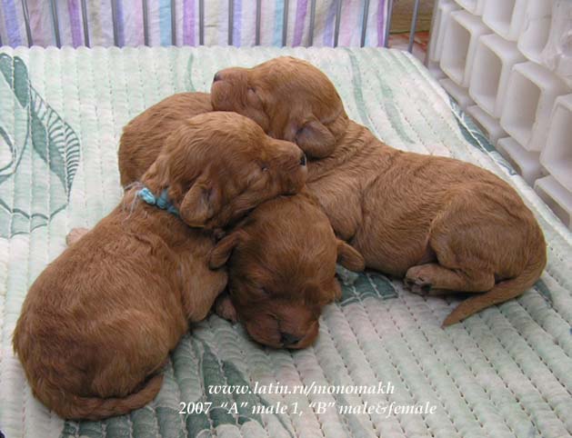 Вот любимчик форума Артошка в приемном помете Б. Артоша сейчас яркий абрикос. Его молочные брат и сестра тоже яркие абрикосы, но светлее чем он. Артошу вязали с ярко-абрикосовой сукой (не темной, умеренно интенсивного окраса) - щенки ярко-абрикосовые, средней интенсивности. _______________________________________
