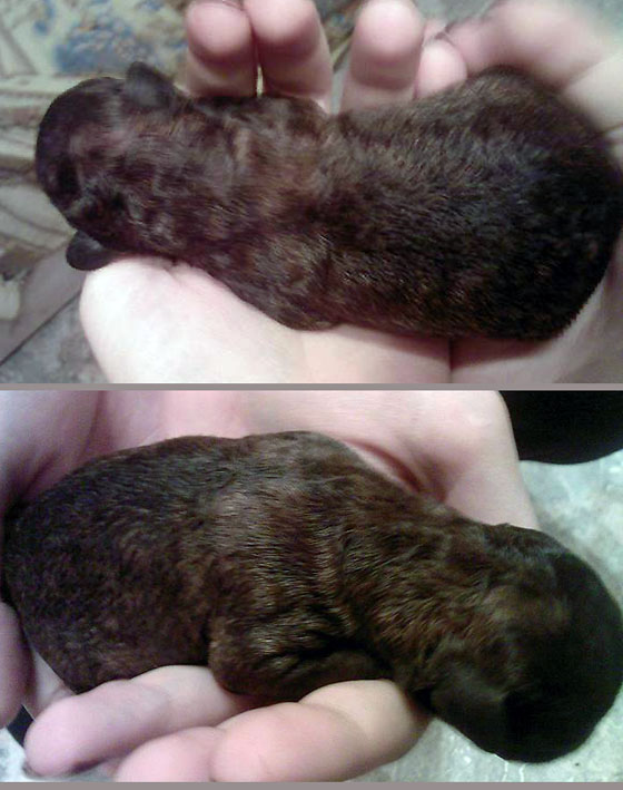 Фото сделано на телефон, поэтому качество плохое. Нет, это не тигровый окрас. В первый момент показалось, что подпал только на боках, как и в прошлый раз, и на шее. Но когда щенок подсох, стало видно, что она вся вот такая рыже-черная, соболиная. Ну, и как теперь? Это плембрак считается или соболиный разрешен? Но я думаю, что она перецветет в серого, как и ее полусестра - тетка.