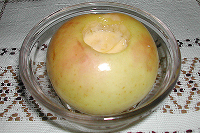 ФАРШИРОВАННЫЕ ЯБЛОКИ Печеные яблоки - это вкусное осеннее блюдо. Масса для фарширования может быть самая разнообразная, начиная от простой сладкой (шоколад, сгущенка, мед), до довольно оригинальной - кисло-сладкого, солено-сладкого вкуса... Я перепробовала очень много различных начинок для тушеных яблок, но все же больше всего мне нравится начинка, которой поделилась Анастасия на сайте Кулинар: белый шоколад + сыр + орехи. Мне всегда нравилось сочетание вкусов сыра и шоколада. А в этом рецепте букет дополняют печеные яблоки и орехи. СОСТАВ 1 крепкое сочное яблоко, желательно осенних или зимних сортов НАЧИНКИ 1~2 дольки белого шоколада, 1/2 грецкого ореха (или любые другие орехи - фундук, миндаль, кедровые, фисташки), кусочек сыра творог, сахар, изюм (или порезанная курага, или чернослив) творог, сахар, лимонная цедра сгущенное молоко (простое или вареное) очень мелко порезанный лимон (вместе с кожурой), сахар, тертый сыр мед, измельченные орехи сливочное масло, измельченные орехи, при желании - изюм (или курага, или чернослив) любые ягоды, сахар (или мед, или сгущенное молоко) густое варенье, измельченные орехи очень маленькие сухарики, сливочное масло, джем или повидло вареный рис, сливочное масло, сахар, изюм (или курага или ягоды из варенья, или чернослив) сладкая каша на молоке, любые наполнители (изюм, курага, чернослив, ягоды свежие или из варенья, цукаты, шоколад) марципан шоколад Из яблок вырезать центральную часть, стараясь не прорезать насквозь. Лучше всего для вырезания серединки у яблок использовать специальную круглую ложку с острыми краями. За неимением такого приспособления можно использовать обычные нож и чайную ложку. Ножом вырезать в яблоке конус со стороны черешка, а ложкой потом выскоблить сердцевину вместе с семечками и частью мякоти. В полость яблок вложить начинку. Начинка должна немного возвышаться над краем яблока. Яблоки поставить в форму, желательно стеклянную. Если форма не стеклянная, то на ее дно нужно налить несколько ложек воды или смазать сливочным маслом. Поставить в разогретую до t=180°С духовку на 15~30 мин (в зависимости от сорта и размера яблок). _______________________________________