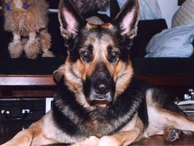 Рыженькая выглядит более "натюрель", чем нафененный Макс :), но она хорошенькая. Стрижка у нее стильная :) А за овчаром её и не видно :) Красивый был пёс...