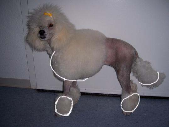 Русгая,очень не плохо,для начинающего!Чувствуется, начинаете проникаться пониманием дела.Я, хоть и стригу давно, но тоже не профи.К выше данным советам могу добавить ,что : необходимо ещё закруглить ( снять фаску) верхнего края помпонов передних лап и закруглить нижний.Задний же помпон должен иметь вид неправильного яйца, лежащего слегка на боку.Лапа спереди должна быть забрита до самого скакательного сустава ( чтобы он обрисовался, иначе лапа визуально становится спрямлённой,без колена).А вот на "пятке" линия выбритой шерсти заканчивается над скакательным суставом,здесь желательно оставить побольше шерсти ( в этом месте какраз находится вершина импровизированного яйца).Далее линия идёт по выпуклой косой вниз.Мне плохо удаётся рисовать курсором, но я попробую, всёже, нарисовать....Да, и шерсть на конце хвоста я бы убрала почти полностью ( ну, 1 см можно оставить) и плавно закруглить , чтобы хвост выглядел компактнее.Шерсть над глазками можно пока не отрастёт достаточно,забирать под две резиночки ( над каждым глазом ),а потом соединить в одну.