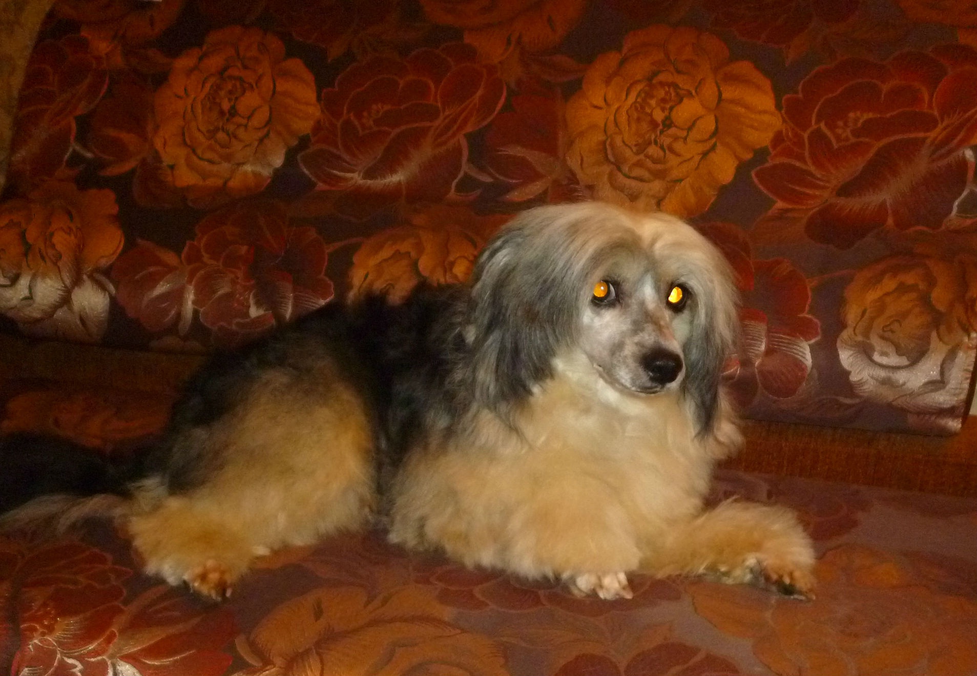 а это мой любимчик-пуховый кобель от моей китаянки Очаровашки Джан,очень мордой похож на маму,но очень волосатый.Летом из него делаем голого и к зиме он ещё не очень обрастает,зато весной-краавец!