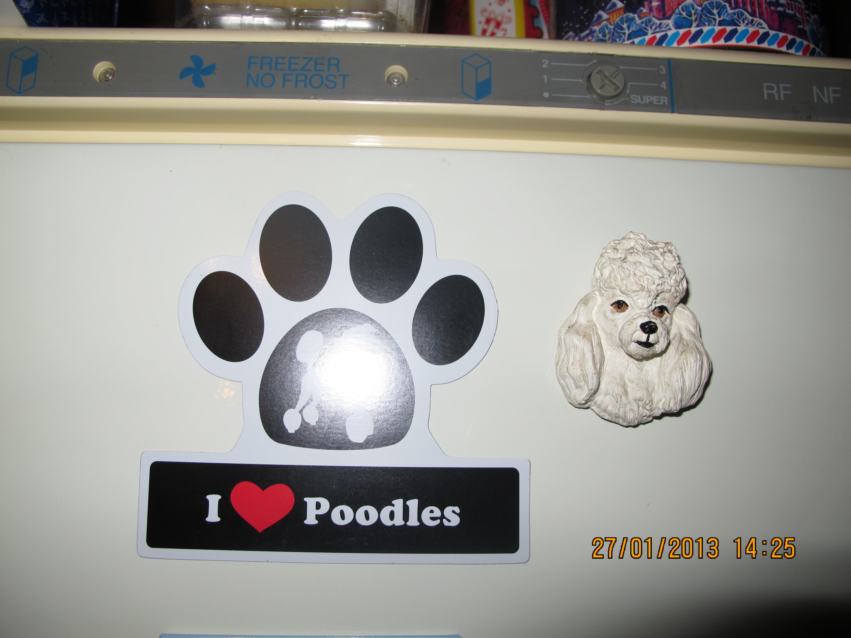 А вот мои новогодние подарочки в этом году: календарь с пуделями, фартук, подставки под чашки; магнит в машину был благополучно прилеплен на холодильник и фигурка пуделя - соседи привезли из Тайланда :) выкладываю: |