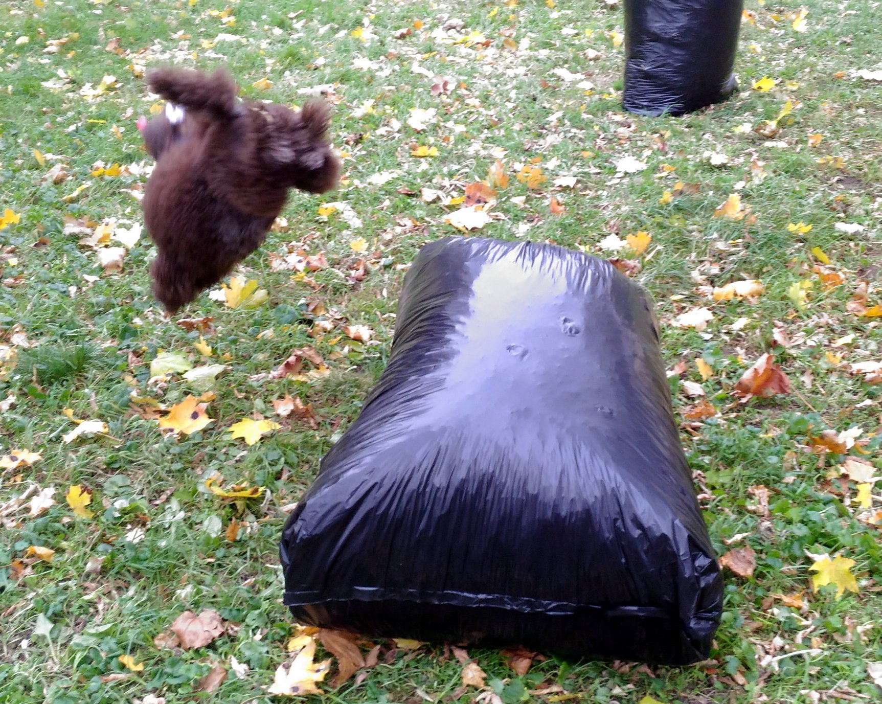 Это мешки с опавшими листьями. Дашуля-красотуля при виде такого добра теряет рассудок, начинает носиться кругами и прыгать через эти мешки, уж очень она это дело любит. Жаль только, что на телефон такие скорости заснять нереально, получаются коричневые тени :) Ну хоть что-то.