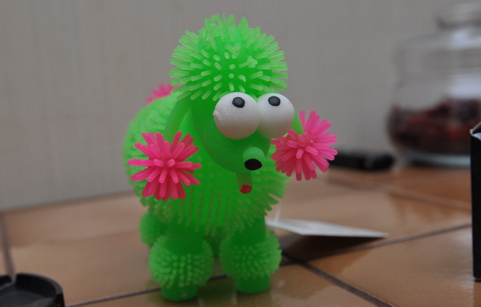 Еще был такой же стоячий в коричневой обувке и два абрикосово-красных пуделя в континентале, один лежачий, второй сидячий, фигурки маленькие, по 5 см где-то. А еще вот такого чукчу китайского купила, шаталась по магазину, зашла в отдел, где все для дома китайского производства и на кассе висели такие пудели разного цвета. По-моему уже его показывали. он мягкий, внутри шарик, при ударе начинает светиться: _______________________________________