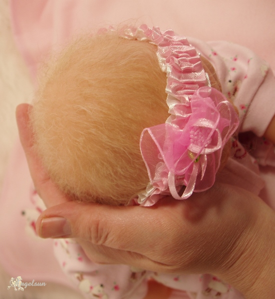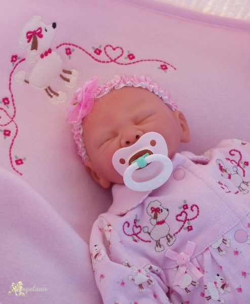 Emma was shaded with various Genesis oil paint color washes to achieve this beautiful, newborn skin tone. She has slight mottling of the skin, just like a real newborn and delicate veining in her temples, eyelids, wrists and soles of her feet. The parts were heat set for durability and permanence. Then, she was gently blushed for added dimension and realism. All materials were chosen with care for quality and longevity.