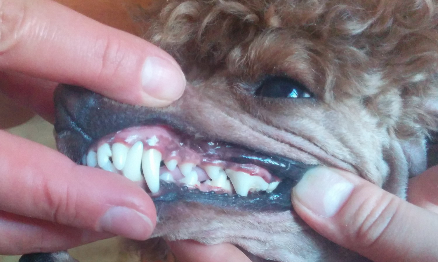 Ездила в Казахстан на эти майские праздники, приводила в порядок пуделей мамы и тёти. У Лолы маминой (серебристый, миниатюрный пудель, 5 лет) зубки тьфу, тьфу чистые. В этом году ей делали в Новосибирске ультразвуковую чистку. Зубы были все в сталактитах, снаружи и изнутри. Удалили несколько зубов, они так пахли сильно, были даже кисты во рту. Сейчас повторюсь, тьфу, тьфу все в норме. Собаку перевели на корм, раньше она ела натуралку и стали чистить зубы тропиклином, который показывали выше. До этого редко, но пользовались пастой для собак. Не знаю что помогает сейчас гель или корм, но результат на лицо. Это очень радует. У тёти собака жуткая кусака (красный, миниатюрный пудель, 4 года), в рот ей никто кроме меня не заглядывает. До трех лет у нее были белоснежные зубы, потом стал образовываться налет (ест натуралку), стала меньше грызть косточки. В этот раз когда раздвинула ей губы ужаснулась увидев зубы. Пришлось брать скребок в руки и орудовать им. Хорошо камень был только снаружи, изнутри скребком я бы не убрала. На четвертом премоляре камень был как глазурь, у десны толщиной где-то 2 - 2,5мм: Своим (серебристые, миниатюрные 12 мес и 5 лет) я тоже чищу зубы тропиклином. Младшая еще молодая, ей год, любит грызть, зубки у нее белые, только на премоляре четвертом немного в углублении есть скопление налета. Старшей раньше два раза делали чистку ультразвуковую(если бы не моя лень и желание больше узнать об уходе за зубами, не пришлось бы к этому прибегать), сейчас она тоже ест корм + чистка тропиклином с щеткой, налет значительно меньше стал образовываться, иногда приходится прибегать к помощи скребка. Скребок все-таки очень нужная вещь. _______________________________________