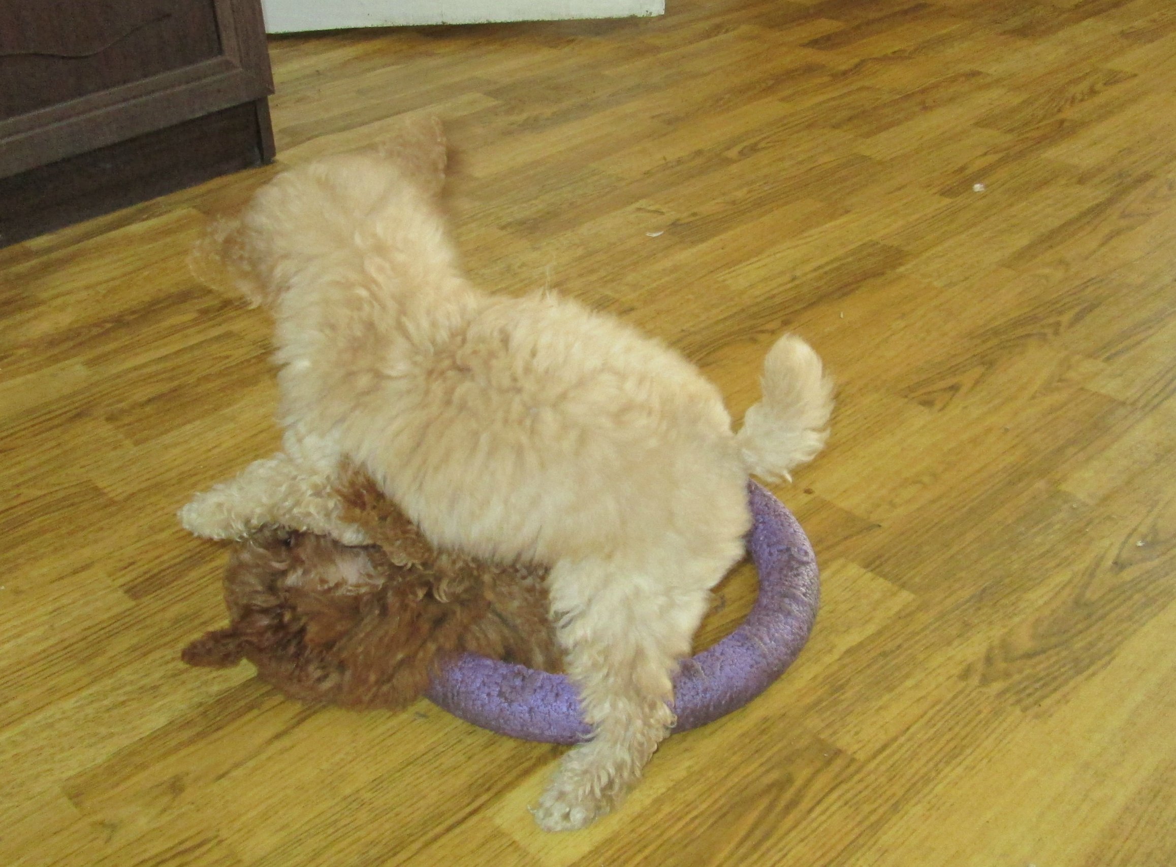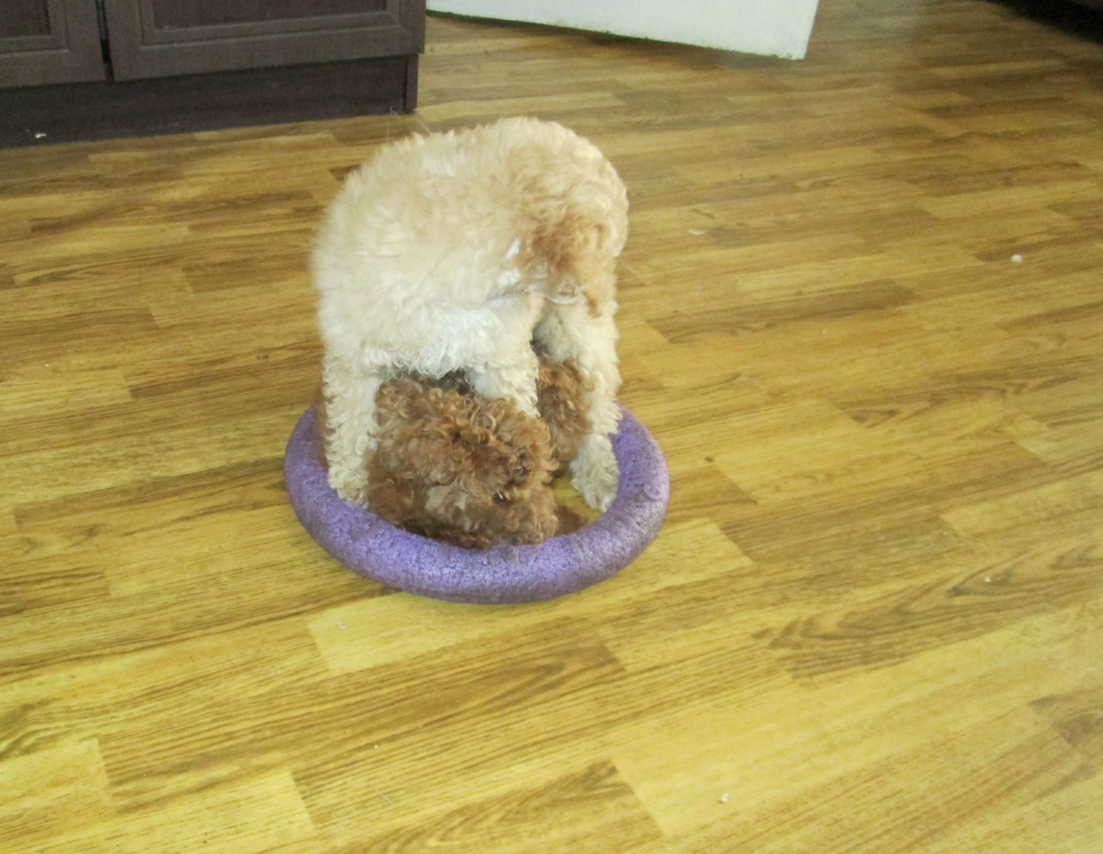 Ну,а щенки продолжают меня удивлять.Я то думала-пуллер игрушка для моих больших,ну один помёт малышей в нем спал-ан нет!молодое поколение делит его опять!