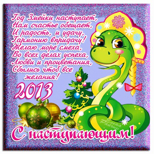 ![]() Пусть Змейка в этот год Много счастья принесет! Сколько снега за окном, Столько теплоты в ваш дом! Сколько лампочек в гирлянде, Столько радости во взгляде! Сколько пузырьков в фужере, Столько же удачи в деле! Сколько за столом гостей, Столько радостных вестей! Сколько праздничных одежд, Столько сбывшихся надежд! _______________________________________