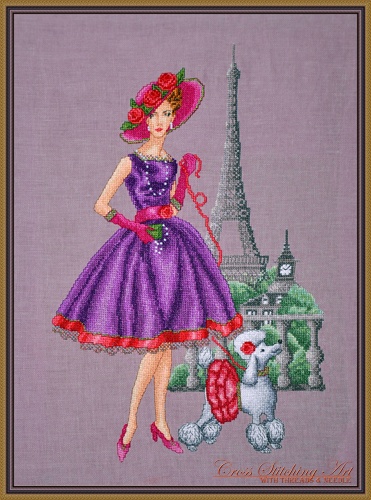 После того, как я закончила вышивку "Дама в зеленом...Prancing Poodles", мне хотелось повторить эту работу, но в другой цветовой гамме, в комбинации мулине и бисера. Хотя... эта идея возникла еще на старте первой вышивки... Все необходимое было выбрано по цвету и куплено в начале июня 2015 года. Медленно, но верно закончила ее в апреле 2016))) Работа оформлена в рамку размером 30х40. К сожалению, фото не передает настоящий цвет бисера и контура рамки. В реальности - синий, фиолетовый цвета более глубокие и насыщенные. Два серых оттенка бисера и белый при искусственном освещении мерцают. Больше фото вышивки можно посмотреть в моем альбоме на фэйсбук _______________________________________
