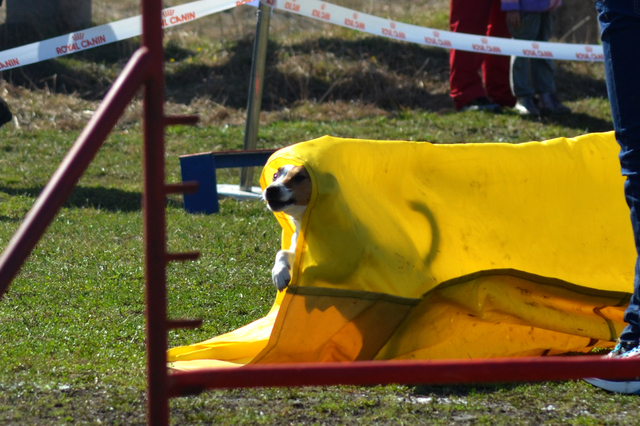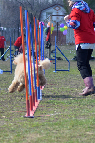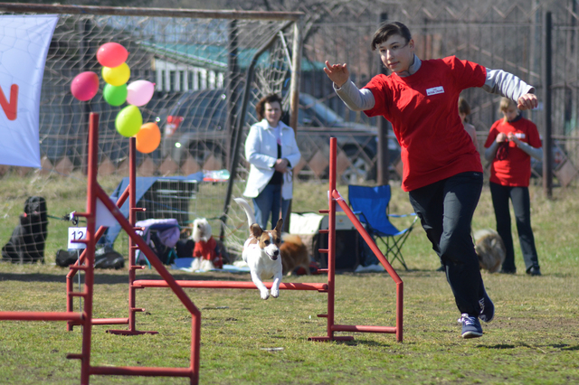 Праздник начался с выступления аджилистов. Как оказалось, первоначально планировалось 2 трассы разной степени сложности, но когда первую (легкую) трассу отбегали, то времени на установку 2-ой уже не оставалось - мероприятие началось не ровно в 10 часов, как планировалось, а позднее, т.к. народу было еще очень мало. В нашей группе была девочка-старшклассница с двумя шпицами. Со старшим она регулярно ходила на занятия, даже на январских соревнованиях в Дзержинске заняла с ним 2-е место, но вчера он что-то не очень удачно выступил, а второй - молоденький - вообще не взял даже 1-ый барьер, все кругами бегал, и они не прошли трассу. Она очень расстроилась, а я потом узнала, что до начала мероприятия на этого шпицика набросился один кобель и потрепал его немного, видно мальчик от стресса еще не отошел... Еще один интересный участник нашей группы - джек рассел терьер. С ним занималась девочка, но она не была его хозяйкой, он часто оставался у них на передержке, а в апреле со своей хозяйкой уехал на ПМЖ в Москву, девочка очень была расстроена - у них установились очень теплые отношения. Каково же было мое удивление, когда приждя утром на стадион я увидела его там весело бегающим, оказалось, что ради соревнования хозяйка нашла время приехать в Чебоксары. Про этого песика хочется немного рассказать. На первых занятиях он был совершенно безудержным и неуправляемым - настоящий терьер. Но регулярные занятия, упорство и старания девочки, а также полезный опыт посещения мастер-классов сделали свое дело - он стал следить за движениями рук своей наставницы, слушать и слышать! ее команды. Вчера он, конечно, выступил не очень удачно, но для нас были очень заметны его успехи в этом виде дрессировки. Последний кадр очень интересным получился... |