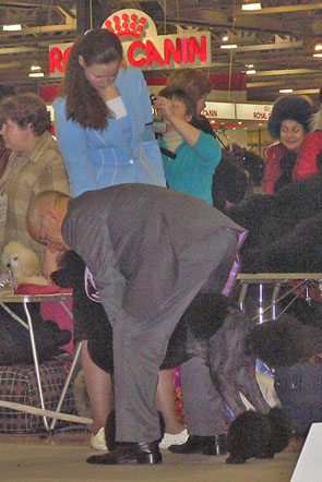 Эксперт сегодня был очень необычный. Во всяком случае, его манера осмотра собаки сидя верхом на ней многих впечатлила. Особенно кобелей с высотой в холке больше 62 см.