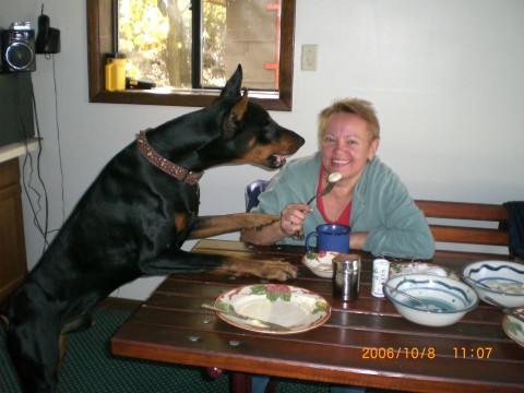 Когда в первый раз с вилки давала ему, просто предупредила, чтобы брал тихонько, а то можно пораниться, он взял так осторожненько, как-будто всю жизнь с вилочкой кушал. Бывает, что Тима не выдерживает когда кусочек остынет, особенно на даче, там на горном воздухе апетит жуткий нагуливается: LioudmilaSherman добавил(а) [date]1168371277[/date]: Лен, ты все про доберманов, про доберманов... что они не такие,как пудели... А я своего добермана пуделем сделала , только не забрасывайте помидорами, у меня есть excuse : так нарабатывалась на стрижкаx в в своем груминге, что решилась только на короткошерстную собаку, но с пуделиным характером...
