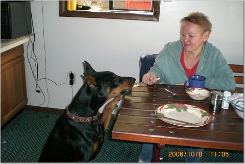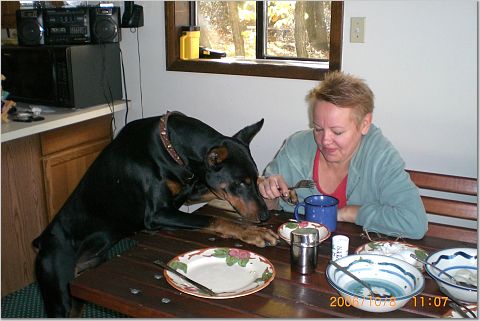 А я люблю, когда у меня собака куски выпрашивает, компания за столом, когда один трапезничаешь))). И ручки на коленки мне свои кладет, и голову).