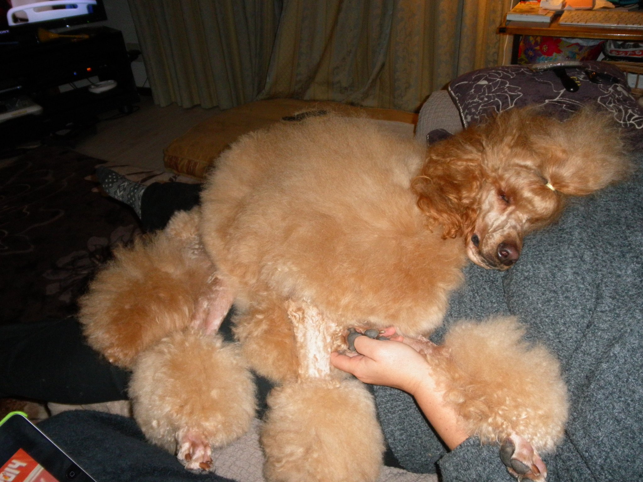 На диване - после "мытья-стрижки-брижки" уставшая девочка спит.