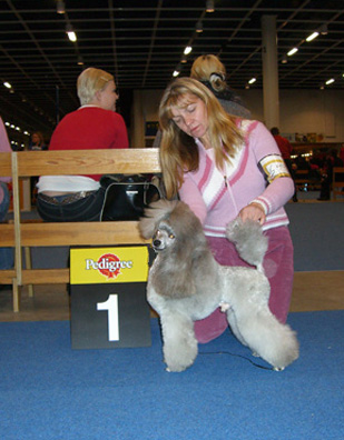 Серебряный Век Император Мой на выставке-Finnish Winner.CAC, CACIB, Finnish Winner, Bos в конкуренции из 14 кобелей современного окраса.Фото и стрижка Галины Алексеевой.