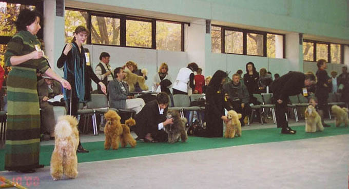 Вот еще один трагический эпизод из истории красного окраса. Мой ребятенок (сын Лимона) из помета "Ф"...Шапка Мономаха, в возрасте 10мес и неделя приехал на Ч Европы в Познань (2000г). Как раз в тот год вышло постановление - красным не выше "оч.хор". Вот он на снимке, второй слева. Он был лучшим в ринге и был снят за окрас. Его хотели дисквалифицировать но после моего темпераментного объяснения с экспертом дали "оч.хор". Хозяйка была в шоке... _______________________________________