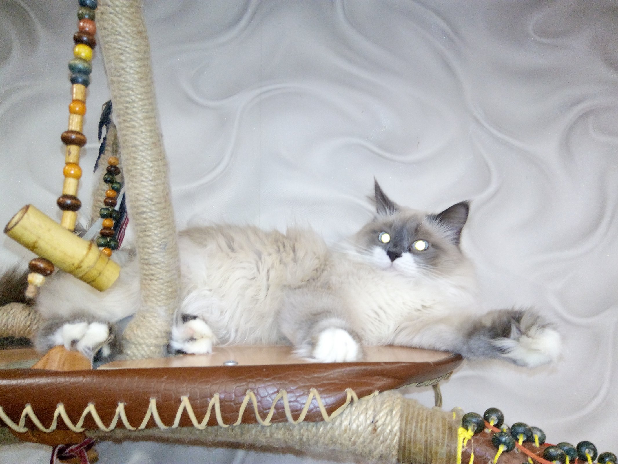 Сам котик очень ласковый, нежный.. но пока что боится большого пуделя, я пока большому не позволяю к нему подходить, котик иногда сам подойдет, носик большому понюхает и опять назад пятится..