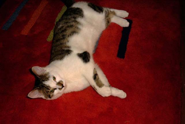 Еще в России вопрос о кошках был поставлен ребром. Я честно спросила о важном - любит ли Пол кошек. Немножко прикалывалась, но до определенной степени, вопрос был о том, насколько комфортно МНЕ там будет. Я не старая дева и не паническая кошатница, но присутствие в доме мурлыкающего и царапающегося существа помогает ощутить дом Домом, особенно на чужбине ( естественно, я только о себе). Вот. Ответ был положительным. Ура! Приехала, пожила немножко, заслужила дешевую популярность среди детей тем , что кошку хотела. Они как-то увязали возникновение такой ценности как кошка в своей жизни со мной лично и, наверное, поэтому меня полюбили. Поездили по приютам для кошек - никто не лег на сердце, какие-то английские отщепенцы, а не коты! Сытые, но не родные. И вдруг стало происходить странное. К нам в гости - на крыльцо, через окно. через дверь стали без конца приходить представители кошачьего племени. Пол был в шоке. Он клялся, что до моего приезда такого никогда не случалось! Они приходили, спали, ели, уходили... И вот один, молодой кошачий парень, худой и бодрый, стал заглядывать все чаще. В доме появилась миска, кошачья еда и игрушки.Мы назвали его Оли. Причем кот был с потрясающим характером - достойный, ненавязчивый и- честное слово - с чувством юмора! Однажды принес в дом чужую мышь (правда, игрушечную), видимо стибрил у какого-то другого кота. Так прошло 2 месяца...А потом я уехала. Пол написал мне, что Оли ушел через день после моего отъезда. Я не беспокоилась, т.к. кот был чрезвычайно самостоятельный и порой гулял по несколько дней. Но он так и не объявился. Что это было? Случайность, может? Вроде бы он моей персоной не очень -то интересовался... Вот его портрет - Сытый Кот на Красном ковре _______________________________________