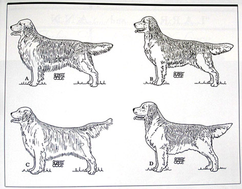 Он колебался, но первым поставил собаку В потому, что она больше соответствует американскому стандарту. Про собаку С он пишет "сеттериная длинная шерсть". Обратите внимание, что у всех голденов, кроме собаки С, шерсть в паху подрезана. А я, когда писала про нижнюю линию выровненной шерсти имела в виду вариант груминга собаки А. _______________________________________